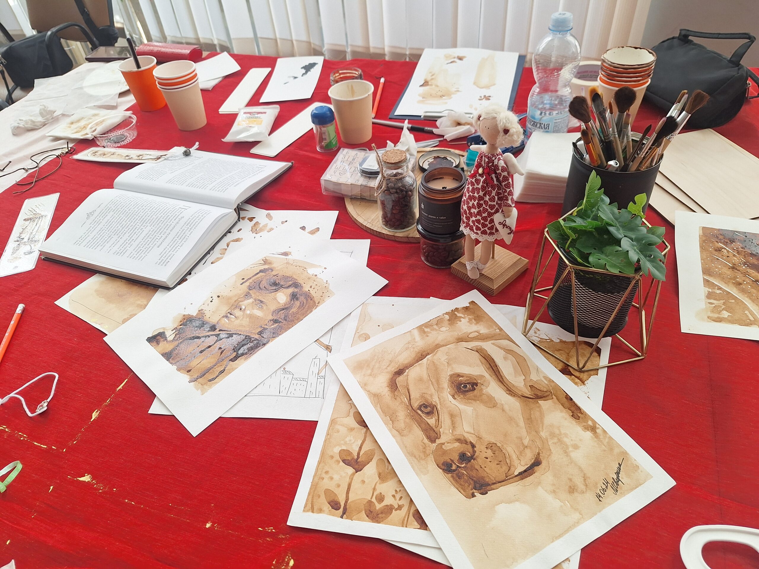 На этом чудеса не закончились. Любовь к кофе, книгам и рисованию объединила участниц второго мастер-класса от студии «Кофе Арт», поразивший своей простотой и оригинальностью исполнения. Обычное и любимое всеми кофе превратилось в основу для создания книжных закладок. Метод кофеграфии представляла художница Марина Свирина, виртуозно использую кофейный раствор вместо привычных художественных красок. Так что не спешите теперь выливать остатки кофе, а смело используйте его для воплощения художественных фантазий.