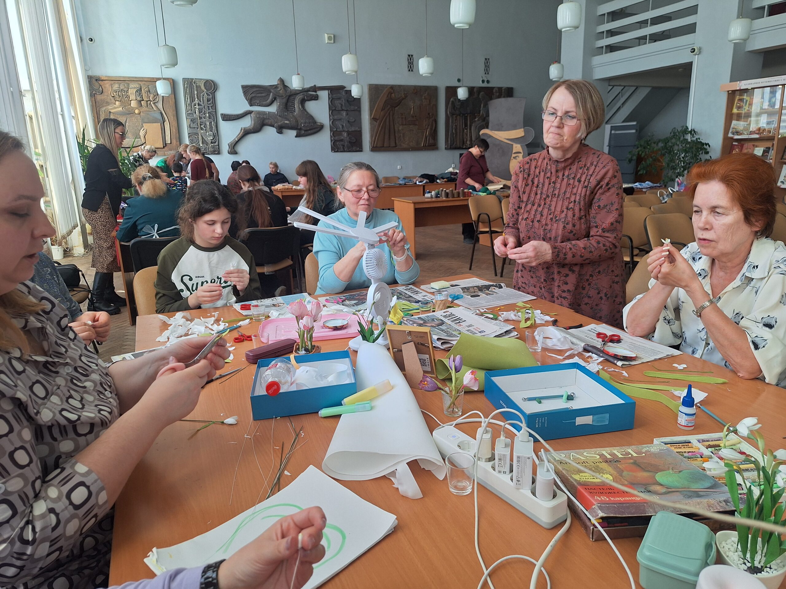 В студии «Фло-Арт» чудеса происходили почти как в сказке «12 месяцев», только не на лесной заснеженной поляне, а за столом в библиотеке. Белоснежные нежные подснежники появлялись в руках мастериц, но не по сказочному волшебству, а благодаря старанию и прилежанию собравшихся, под чутким руководством мартовской сестрицы-весны в роли которой выступала Александра Синицына.