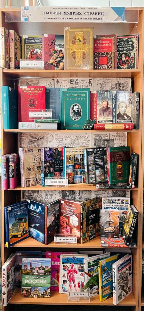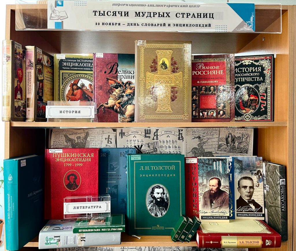 Все знают орфографические, орфоэпические или толковые словари, и они не устарели в нашу цифровую эпоху. Появились и новые типы словарей и энциклопедий, например: словари языка писателей, цитат, сленга, пословиц, терминов различных предметных областей. В экспозицию нашей выставки включены справочные издания по истории, литературе, искусству, технологии и природе из фонда Информационно-библиографического центра. В частности любителей истории привлечет издание «Потомство Рюрика» (сост. протоиерей А. Н. Соколов, 2007 г.), включающее биографические сведения о древнейших дворянских родах России. В книгу с родословиями вошли и авторские описания истории княжеств Древней Руси и их правителей. Продолжает тему энциклопедия «Великие правители», посвященная самым известным государственным деятелям в истории человечества.