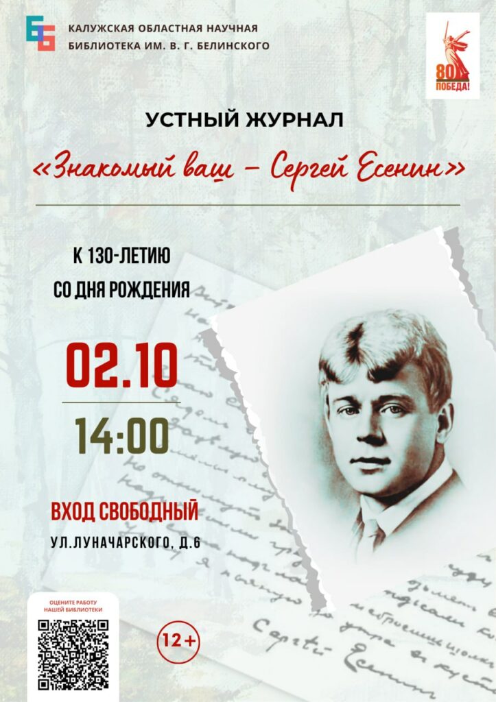 2 октября в библиотеке пройдет устный журнал «Знакомый ваш – Сергей Есенин», разработанный в рамках празднования 130-летия со дня его рождения. В ходе программы будут обозначены основные вехи жизненного и творческого пути замечательного поэта, прозвучат его произведения, показаны тематические видеоматериалы.