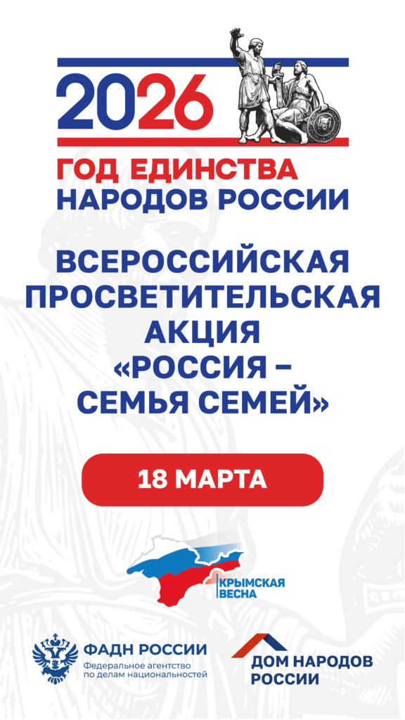 В День воссоединения Крыма с Россией, 18 марта, пройдет Всероссийская просветительская акция «Россия — семья семей». Акция проводится в рамках Года единства народов России и проводится при поддержки Федерального агентства по делам национальностей