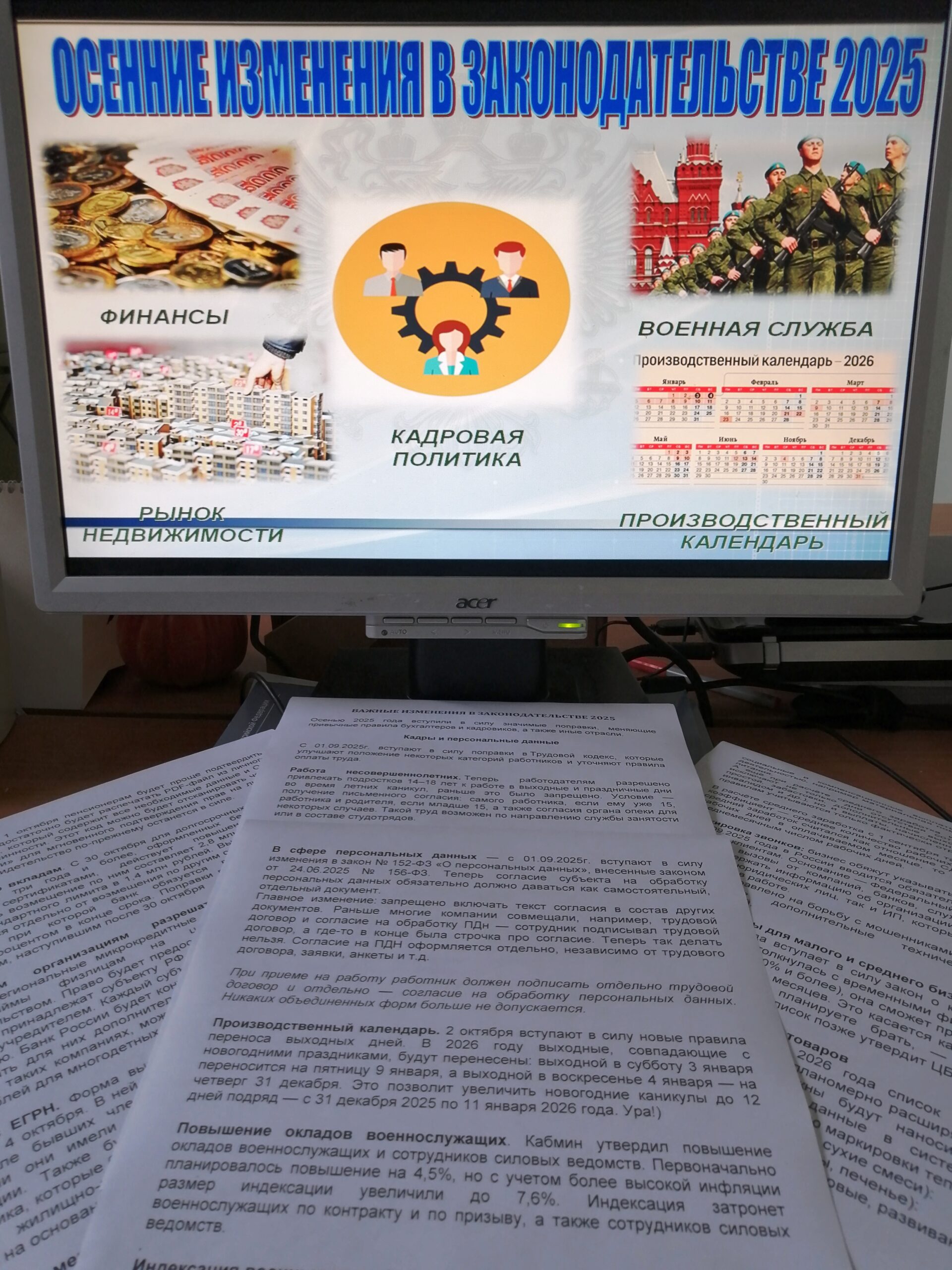 С начала октября в России вступают в силу новые законы, которые затронут выплаты, налоги, кредиты и даже повседневные покупки. Российская законодательная база постоянно меняется и совершенствуется. В этой связи сотрудники библиотеки разобрали важные правовые изменения на встрече с работниками ГКУ КО «ЦБ в сфере экономического развития», такие как индексация заработных плат и пенсий, перестановки в кадровой и налоговой политике, финансировании и пр. Диалог получился информативным и продуктивным.