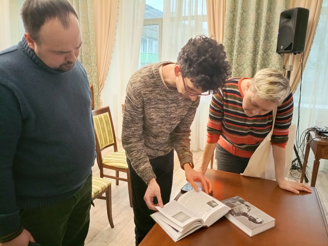 Главный библиограф Краеведческо-информационного центра библиотеки М.В. Герасимова представила обзор книжных новинок из фонда КИЦ. Особый интерес у присутствующих вызвали такие издания, как: «Калужские чиновники — участники Отечественной войны 1812 года: биографический справочник» авторов Бессонова В.А., Добычиной М. А. и И. В. Анатольевича. Книга издана в Калуге в 2024 году (издатель ИП Артюхов). В книге дан обобщённый социальный портрет служащих, которые участвовали в Бородинской битве, а после выхода в отставку связали свою жизнь с Калужской губернией.; Ильюшечкин, Александр Александрович. Западный фронт. Варшавское шоссе: боевые действия 1942-1943 гг. (Калуга: Издатель Захаров С.И. («СерНа»), 2025. Книга калужских историков и поисковиков А. Илюшечкина и М. Мосягина посвящена одной из трагических страниц Великой Отечественной войны-ожесточенной борьбе за контроль над Варшавским шоссе, фокус которой пришелся на территорию нескольких высот и деревень в Барятинском районе современной Калужской области, прилегавших к этой важнейшей транспортной артерии. Сражение за Зайцеву Гору-такое собирательное наименование получили бои — продлилось больше года, с февраля 1942 по март 1943 года. Завершил встречу в клубе Сергей Юрьевич Поляков автор книги «Климов-Завод. Взгляд сквозь время». Это одно из немногих изданий такого объёма и глубины проработки, посвящённое Юхновскому уезду (600 страниц). Книга включает множество ранее не опубликованных архивных документов и фотографий. С. Ю. Поляков передал в дар библиотеки три издания, включая и книгу «Климов-Завод. Взгляд сквозь время».