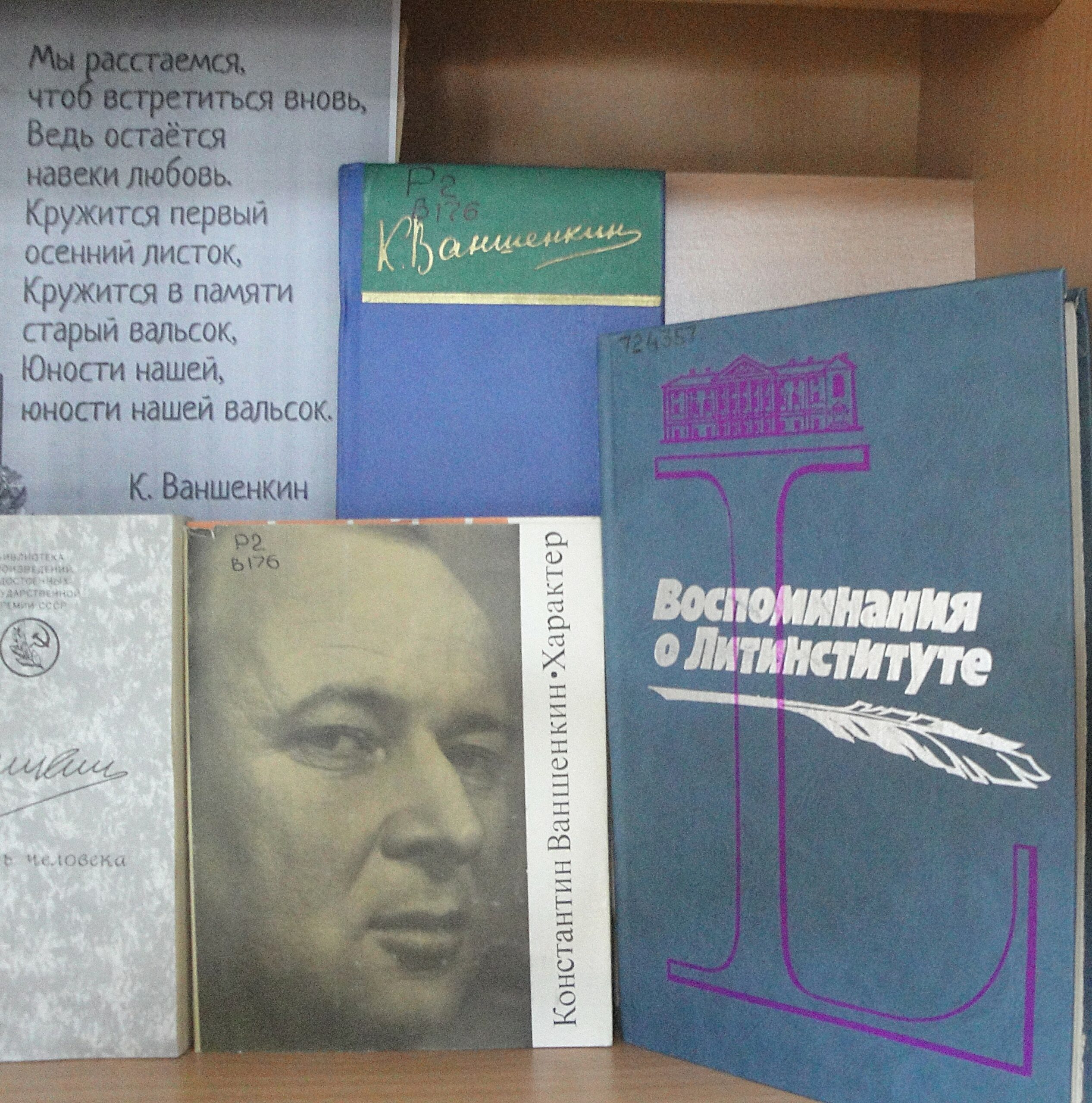 Дорогие друзья! В Калужской областной научной библиотеке им. В.Г. Белинского работает книжная выставка «Я люблю тебя, Жизнь…», подготовленная к 100-летию со дня рождения Константина Яковлевича Ваншенкина. Материал, представленный в экспозиции, включает в себя не только книги о жизненном пути и творчестве автора, воспоминания его современников и коллег по перу, но и издания по истории советской литературы в целом.