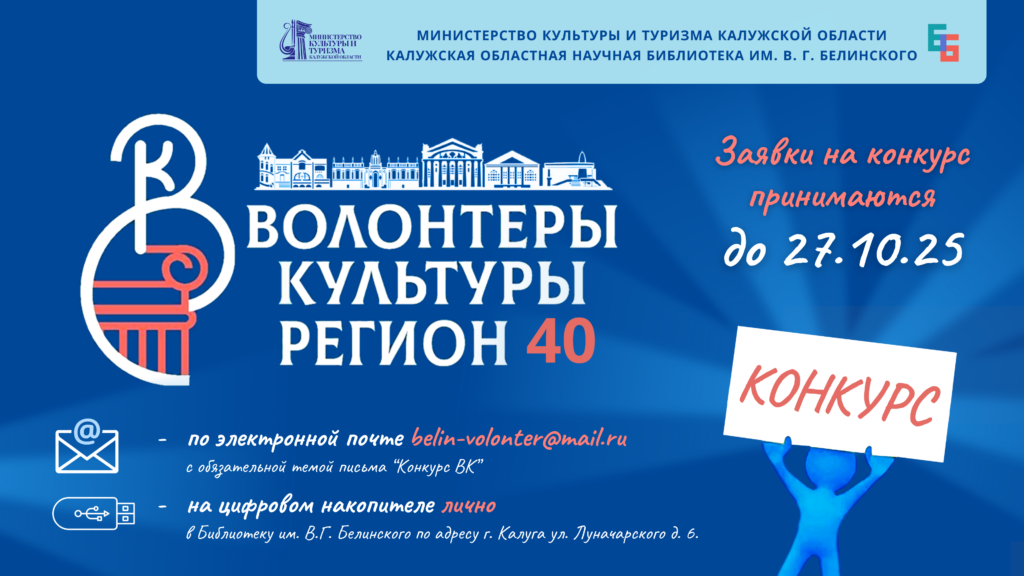 Калужская областная научная библиотека им. В. Г. Белинского и Ресурсный центр добровольческого движения “Волонтеры культуры” Калужской области приглашают принять участие в областном конкурсе «Волонтеры культуры-2025», посвящённом Международному дню добровольцев.